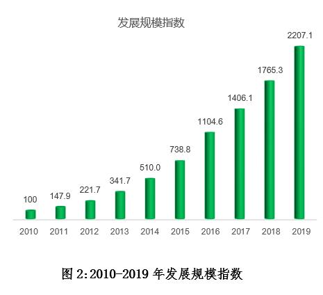 2019年,發(fā)展規(guī)模指數為2207.1,同比增長25.0%。