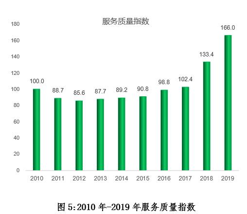 2019年,快遞服務質量指數為166.0,同比提高24.4%。