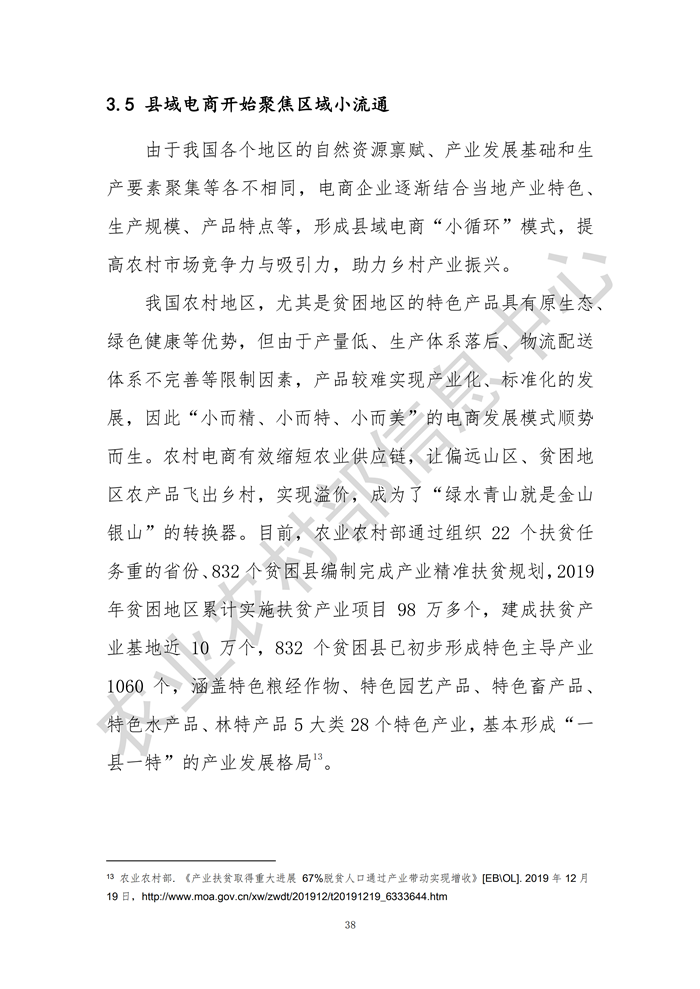 發(fā)布會(huì)指出,2019年全國2083個(gè)縣域網(wǎng)絡(luò)零售額達(dá)30961.6億元,同比增長23.5%,其中832個(gè)貧困縣網(wǎng)絡(luò)零售額達(dá)1076.1億元,同比增長31.2%;縣域農(nóng)產(chǎn)品網(wǎng)絡(luò)零售額達(dá)2693.1億元,同比增長28.5%,其中832個(gè)貧困縣農(nóng)產(chǎn)品網(wǎng)絡(luò)零售額為190.8億元,同比增長23.9%,需求側(cè)的數(shù)據(jù)、信息日益成為供給側(cè)結(jié)構(gòu)性改革的新動(dòng)能,農(nóng)業(yè)的產(chǎn)業(yè)鏈、供應(yīng)鏈、創(chuàng)新鏈、價(jià)值鏈正在加速重構(gòu),電子商務(wù)成為“綠水青山就是金山銀山”的重要“轉(zhuǎn)換器”。